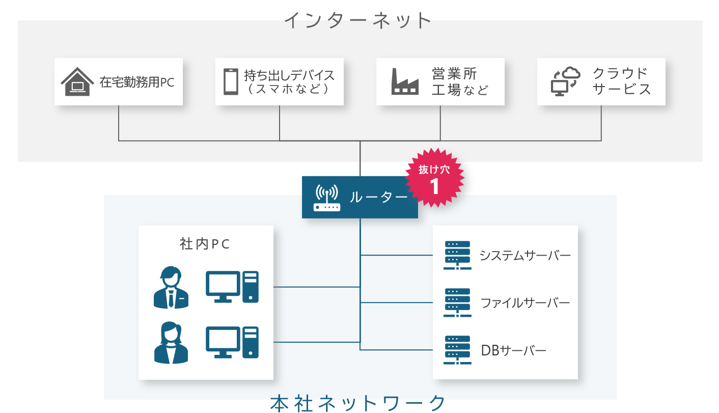 1台が乗っ取られると、そこを足がかりに社内の他の端末やサーバーへ被害が広がります。ルーターでの対策だけでは防げない理由が、ここにあります。